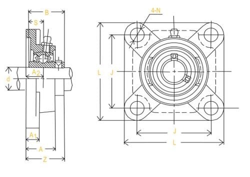 Bu kare flanşlı bilyalı rulman üniteleri, Japon Endüstriyel standartlarında (JIS) ile uyumludur. Dönme yönünün sabit veya değişken olduğu uygulamalar için uygundurlar ve uzatılmış bir iç bilezik ve tespit vidasıyla kilitlemeli bir geçmeli rulmandan oluşurlar. Rulman, bir makine duvarına veya çerçevesine vidalanabilen dökme demir bir yatağa monte edilmiştir. Bilyalı rulman üniteleri başlangıçta orta düzeyde yanlış hizalanmaya uyum sağlayabilir, ancak normalde eksenel yer değiştirmeye izin vermez.